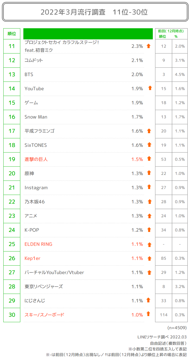トップ30までを見ると、初登場は10位の「ポケモンレジェンズ アルセウス」と25位「ELDEN RING」だったが、それ以外の定番ゲームタイトルも引き続き話題となっていた。また冬の時期だったため30位「スキー/スノーボード」も大きくジャンプアップしていた。