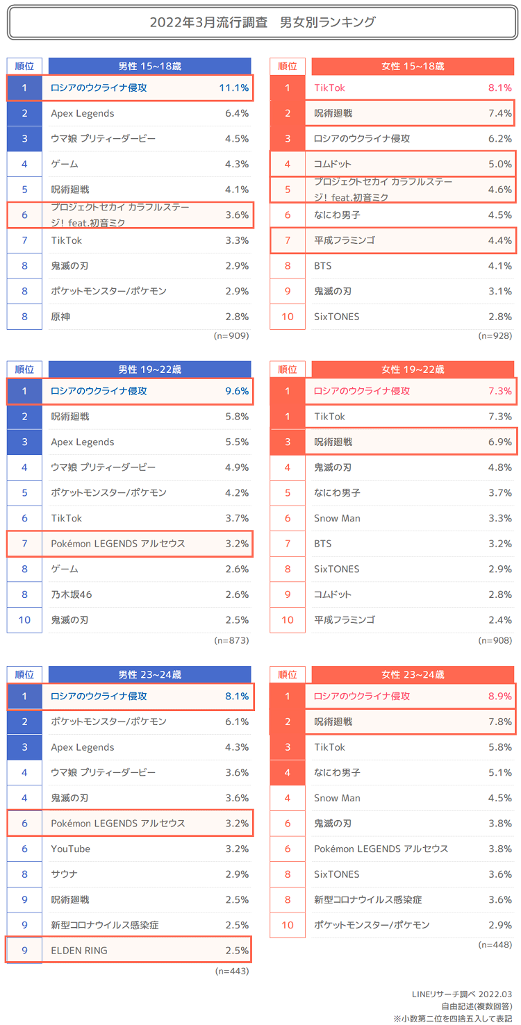 LINEの調査サービス「LINEリサーチ」は、「最新の若年流行調査」の結果を発表した。LINEリサーチでは四半期ごとに15~24歳男女に対して、最近の流行について自由記述形式で調査を行っている。今回は2022年3月の調査結果となる。