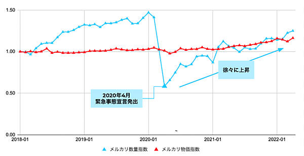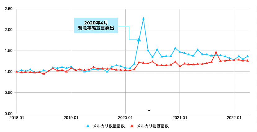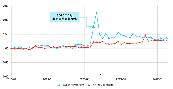 フリーマーケットアプリ「メルカリ」を展開するメルカリは、アプリのメルカリで取引される商品の価格や流通量の変動を示す「メルカリ物価・数量指数」を開発した、と5月16日発表した。変動を指数で可視化した。報道関係や消費者行動、マーケティングなどの研究者に情報を提供。消費動向や二次流通市場、個人間商取引の研究活動に役立ててもらう。