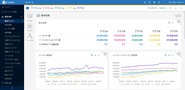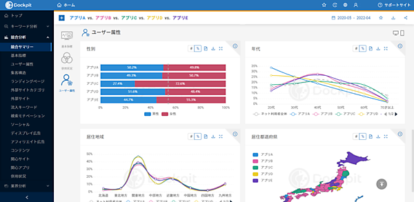インターネット行動ログ分析によるマーケティング調査・コンサルティングサービス事業のヴァリューズは、同社が展開する3C(自社・競合・市場)分析ツール「Dockpit(ドックピット)」に、アプリのユーザー数やユーザーの属性が分かる「アプリ分析機能」を搭載した、と5月16日発表した。個別のアプリ分析に加えてアプリユーザー数のランキングも実装した。