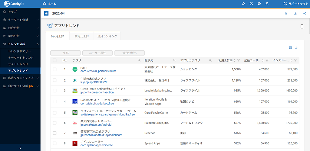 アプリ分析機能は、特定のアプリ名を入力するとアプリの月次起動ユーザー数やインストールユーザー数と、ユーザーの性別、年代、エリア、年収などの属性情報が確認可能。自社アプリユーザーの分析だけでなく、競合他社のユーザーが詳細に分析できる。アプリユーザー数ランキングは6カ月上昇・前月比上昇・当月のカテゴリでアプリの最新トレンドが分かる。