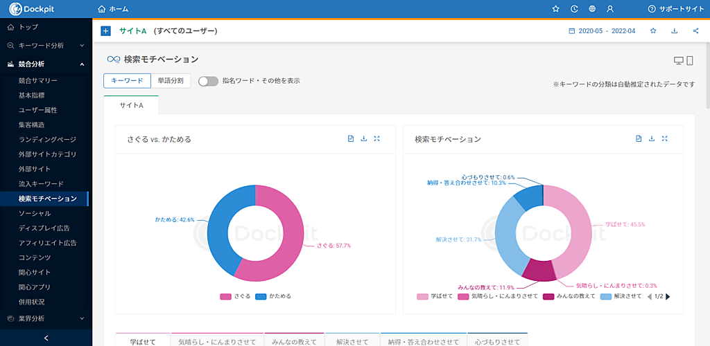 さらに、特定サイトを利用したユーザーの検索動機を可視化する「検索モチベーション」機能も備えた。サイトユーザーの利用目的が分析できる。Dockpitは、ヴァリューズが保有する国内250万人規模の消費者モニター会員のウェブ行動ログデータから3Cが分析可能なツール。直感的なユーザーインターフェイス(UI)のダッシュボードでデータを閲覧して分析できる。