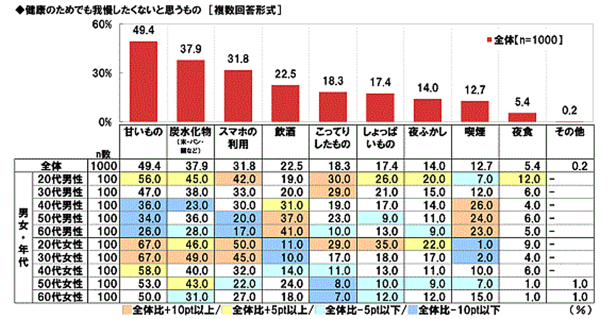 なお「健康のためでも我慢したくないと思うもの」を具体的に聞くと、「甘いもの」49.4%が突出して高く、「炭水化物(米・パン・麺など)」37.9%、「スマホの利用」31.8%、「飲酒」22.5%、「こってりしたもの」18.3%などがそれに続いた。
