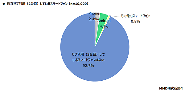 続いて、現在サブ利用(2台目)しているスマートフォンについて聞くと、「所持していない」が92.7%、「iPhone」は2.4%、次いで「Android」が4.1%、「その他のスマートフォン」が0.8%となった。2台目の所持率は1割未満であることから、前述のメインスマートフォンの所持率がおおよそ全体の所持率と言える。