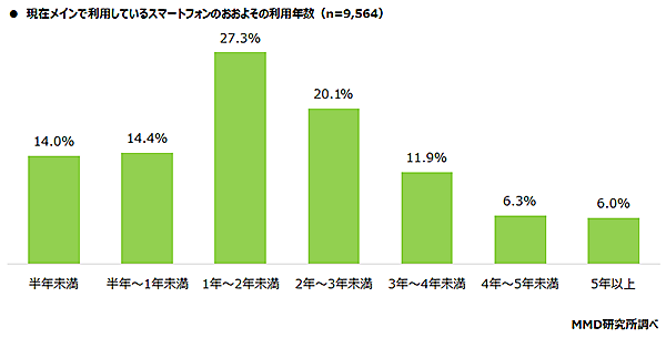 続いて、現在メインで利用しているスマートフォンのおおよその利用年数を聞くと、「1年~2年未満」が27.3%と最も多く、次いで「2年~3年未満」が20.1%、横並びで「半年~1年未満」が14.4%、「半年未満」が14.0%となった。