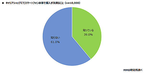 キャリアショップにてスマートフォン単体で購入できることについて聞くと、「知っている」が39.0%、「知らない」が61.0%となった。