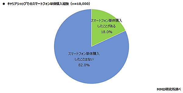 次に、キャリアショップでのスマートフォン単体購入経験について聞いたところ、「スマートフォンを単体購入したことがある」が18.0%、「スマートフォンを単体購入したことはない」が82.0%となった。大多数がキャリアで回線契約とセットで購入しているようだ。