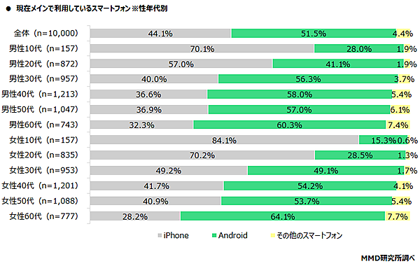 メイン利用スマホのOS利用率は、iPhoneが44.1%、Androidが51.5%。iPhone利用率は10代、20代が最多、Android利用率は60代男女が最多
