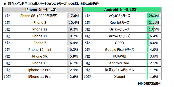 メイン利用しているスマートフォンのシリーズを聞くと、iPhoneユーザーは「iPhone SE(2020年発売)」が17.6%、「iPhone 8」が10.4%、「iPhone 12」と「iPhone 11」が9.2%となった。Androidユーザーは「AQUOSシリーズ」が28.3%、次いで「Xperiaシリーズ」が21.1%、「Galaxyシリーズ」が13.5%という結果となった。