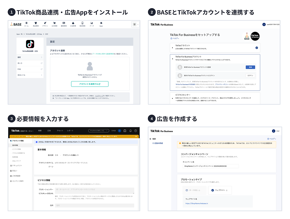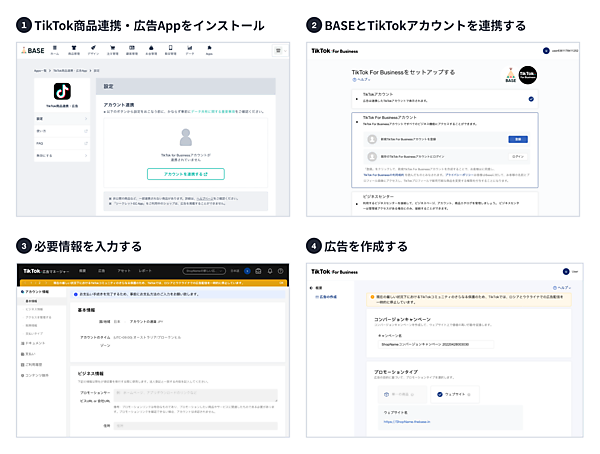 TikTokへの広告掲載は通常、広告アカウント設定と商品情報の登録を自らする必要があるが、TikTok商品連携・広告Appだと、BASE内に登録されているショップや商品データが自動で連携され、少ない手順で可能。最低出稿金額は1日2000円。BASEは初期費用や月額料金がなく、商品が売れた時に手数料が発生する仕組み。現在170万ショップが利用している。