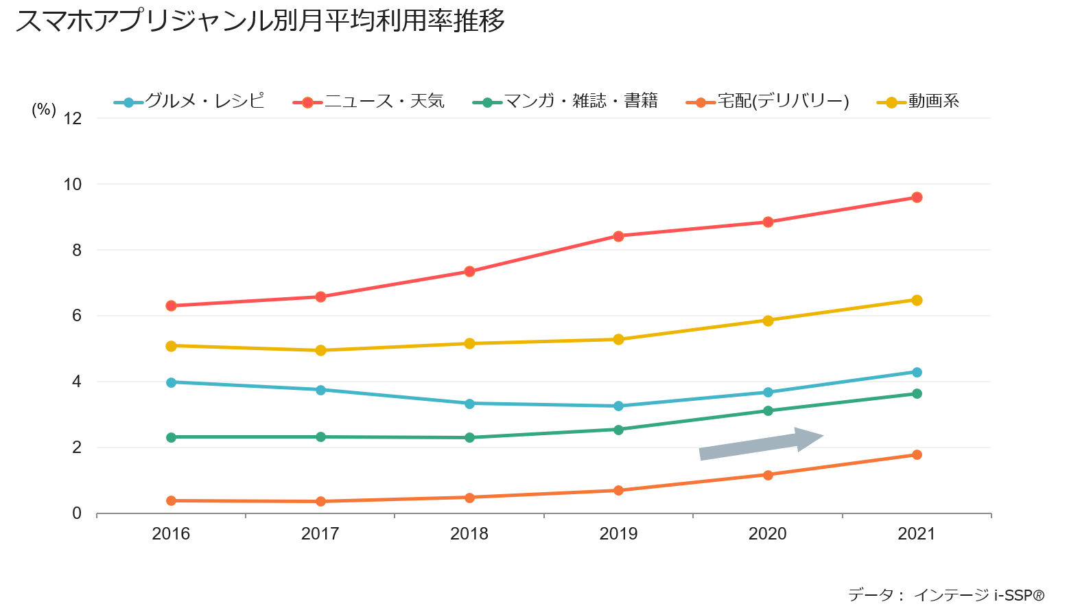 まず代表的なスマホアプリジャンルについて、月次平均利用率の推移を見ると、コロナ禍にさしかかった2019年以降、「ニュース・天気」「グルメ・レシピ」「宅配(デリバリー)」「マンガ・雑誌・書籍」「動画配信」のどのジャンルでもアプリ利用率が伸長している。