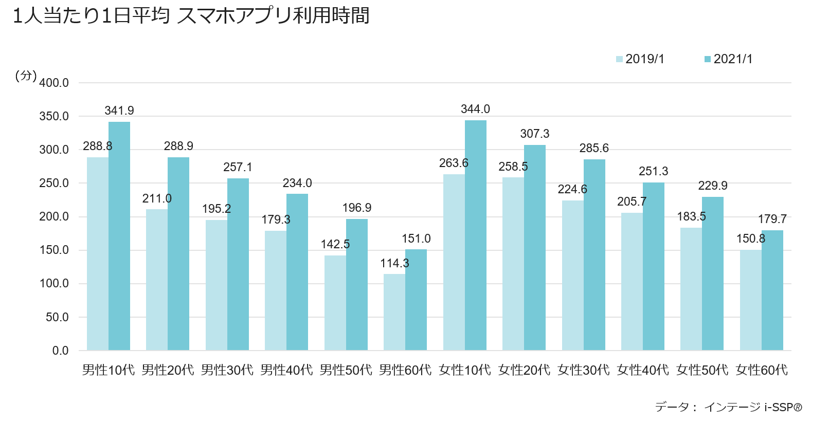 コロナ禍に入る前(2019年1月)と後(2021年1月)で、一日あたりのアプリ利用時間を比較すると、どの性・年代でも利用時間が増加しており、男性平均で約50分、女性平均で約80分増加していた。