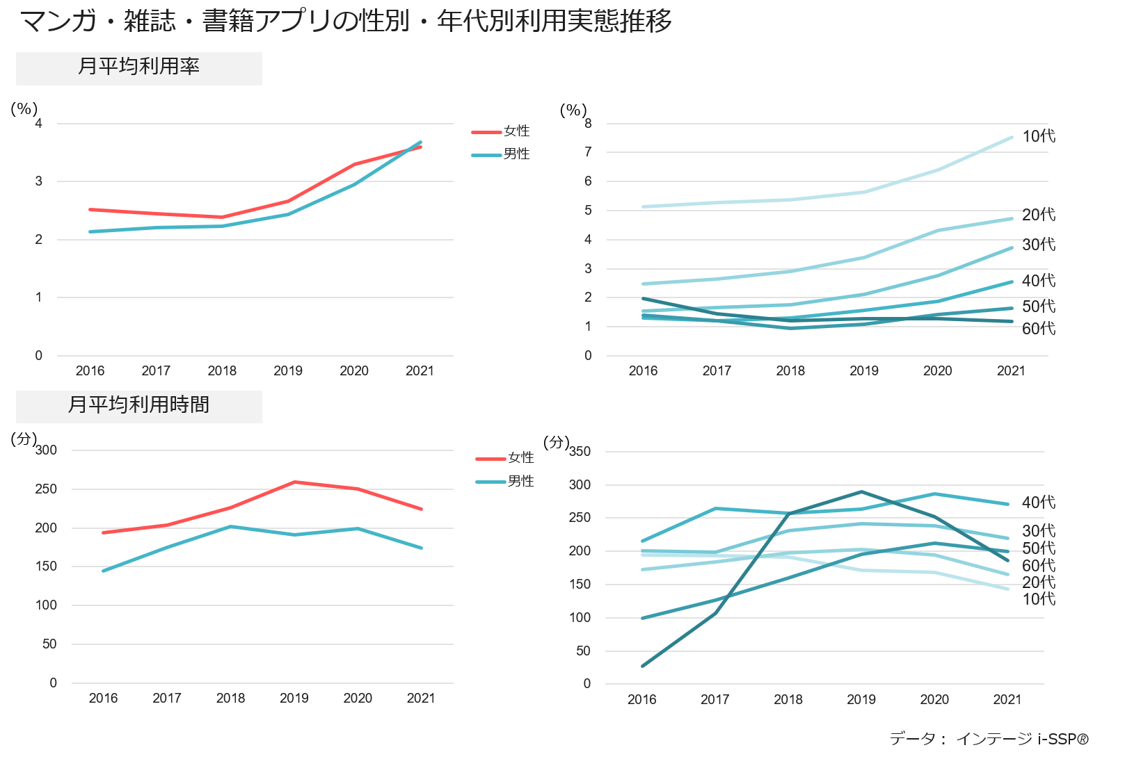 「マンガ・雑誌・書籍」アプリに絞り、平均利用率と平均利用時間の推移を見ると、2019年以降、平均利用率が上昇した一方で、平均利用時間(分)は減少傾向を見せている。年代別では、もともと利用率の高かった10代がさらに伸びていた。一方利用時間では60代が大きく減少したことがわかる。また10代は全年代を通じてもっとも利用時間が短い。これはむしろ読み慣れているため、読了するのが早い可能性がある。高齢になるほど、コンテンツ課金を行いゆっくり時間をかけて作品を読んでいると推測される。