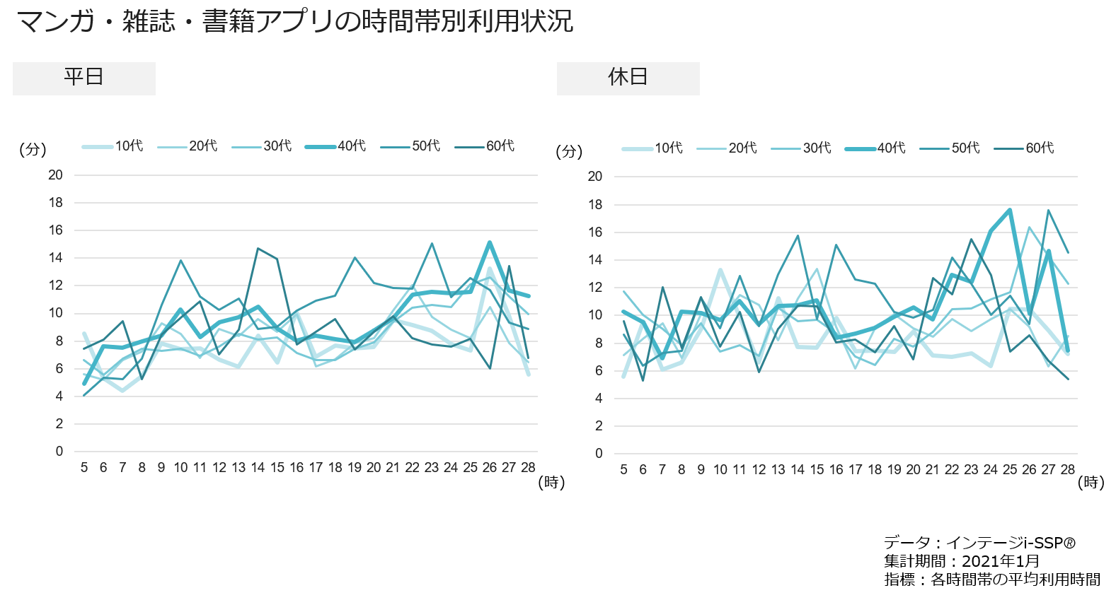 40代以下は「マンガ・雑誌・書籍」アプリを深夜に利用、高齢者は昼間
