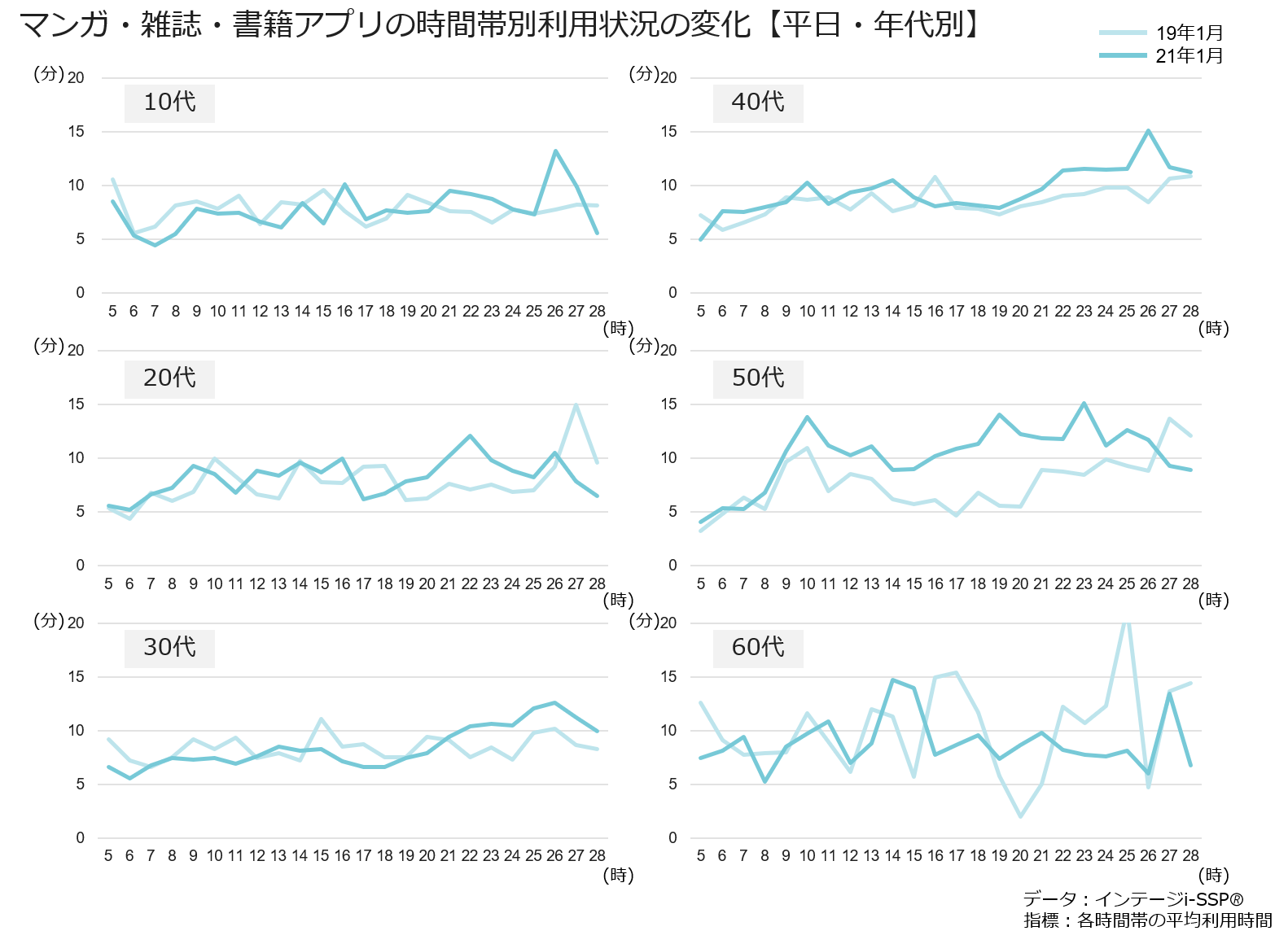 さらに、コロナ禍前後の利用時間帯を、2019年1月と2021年1月との比較で見ると、10代~40代は極端な変化はなかったが、50代は8時~26時のほぼ全時間帯で利用時間が増加していた。