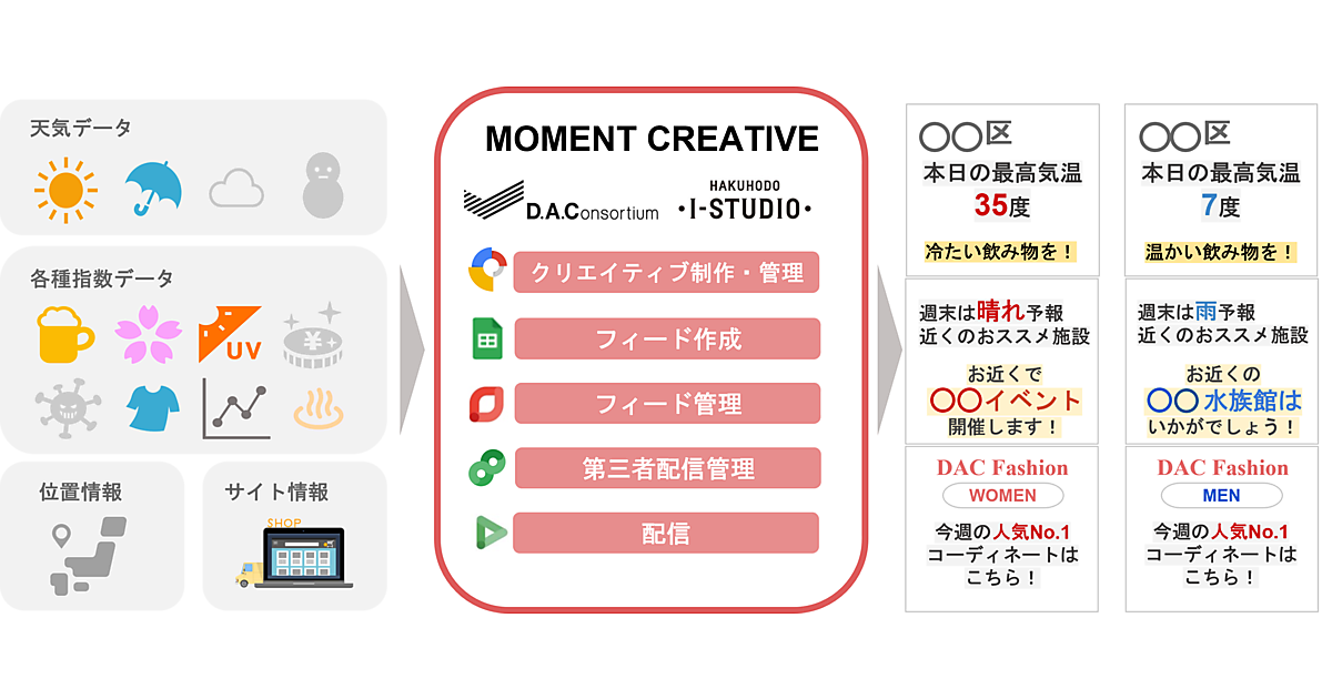 DACの運用型広告の知見と博報堂アイ・スタジオのクリエイティブ制作力を合わせ、データフィード(配信用フォーマットへの変換)作成、クリエイティブ制作、配信・分析を一括提供する。気温で購買率が変わる商品や、リアルタイムに人気が入れ替わる商品などでの利用を想定する。アパレルECサイトの例では、通常のバナー広告と比べてCTR(クリック率)が約200%になった。