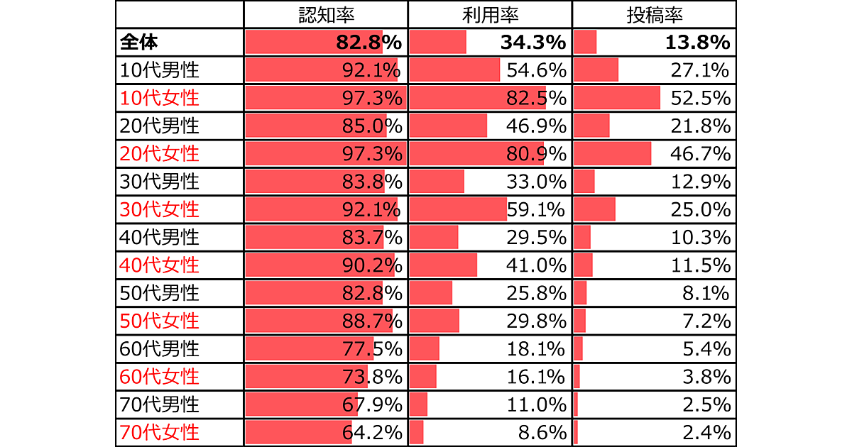 Instagramはやや数値が下がるが、認知率は全体で82.8%、利用率は34.3%、投稿率は13.8%だった。Twitterよりも性年代の差が大きく、10代・20代女性が突出しており、利用率が80%超、投稿率も50%前後と、全体よりかなり高かった。