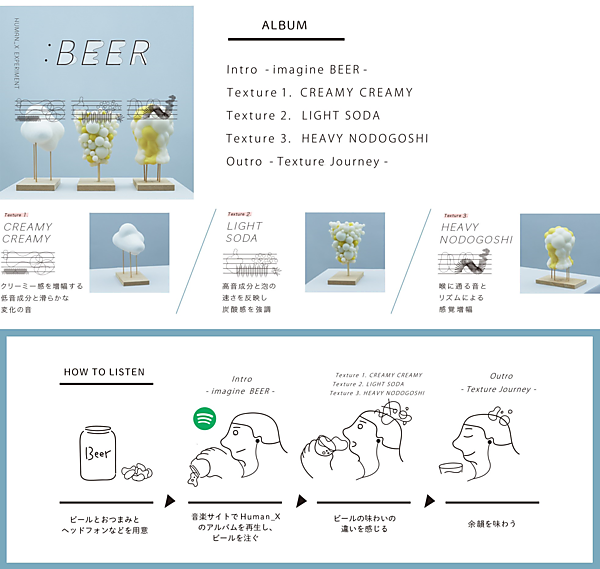 具体的な活動として、鳴海准教授の監修のもとで生活者の日常に関連が深いテーマを起点とした『〇〇×五感体験デザイン』の実験に取り組む。異なる感覚を組み合わせて生活をより豊かにする仕組みを感性的・科学的に開発する。実証実験の第1弾となる「おいしさ×聴覚」のプロトタイプでは、科学的かつ感性的なアプローチで開発した「ビールのおいしさを増幅させる音楽」を公開した。実験の成果は今後も随時公開していく。