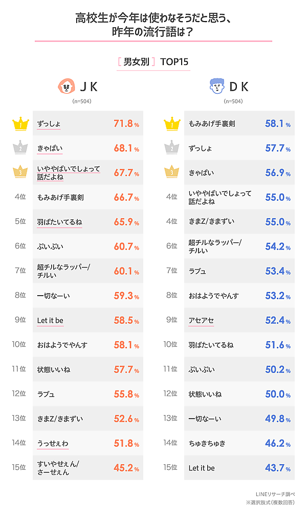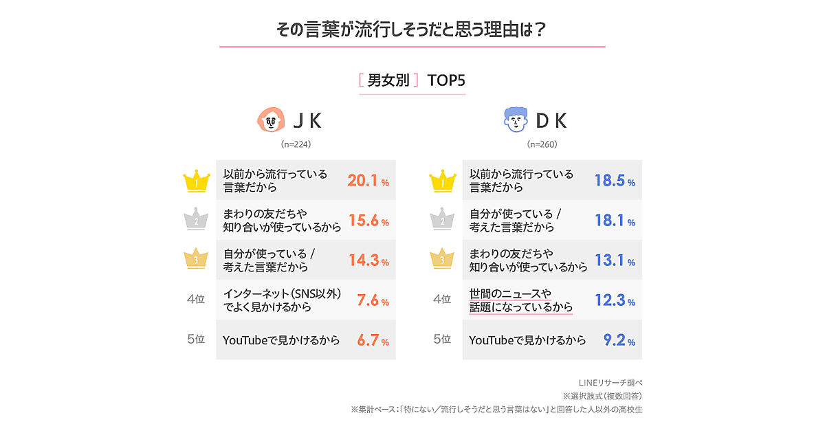LINEの調査サービス「LINEリサーチ」は、「高校生の流行語事情」に関する調査結果を発表した。高校生男女1,008人が回答している。