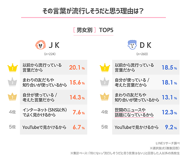 あらためて「その言葉が流行しそうだと思う理由」を聞くと、男女ともに「以前から流行っている言葉だから」が1位。勢いや背景より“流行っているから流行る”という流れがうきぼりとなった。2位以下は男女で違いがあり、男子高校生2位は「自分が使っている/考えた言葉だから」が高い。一方女子高校生は「「まわりの友だちや知り合いが使っているから」が比較的高い数字を示した。