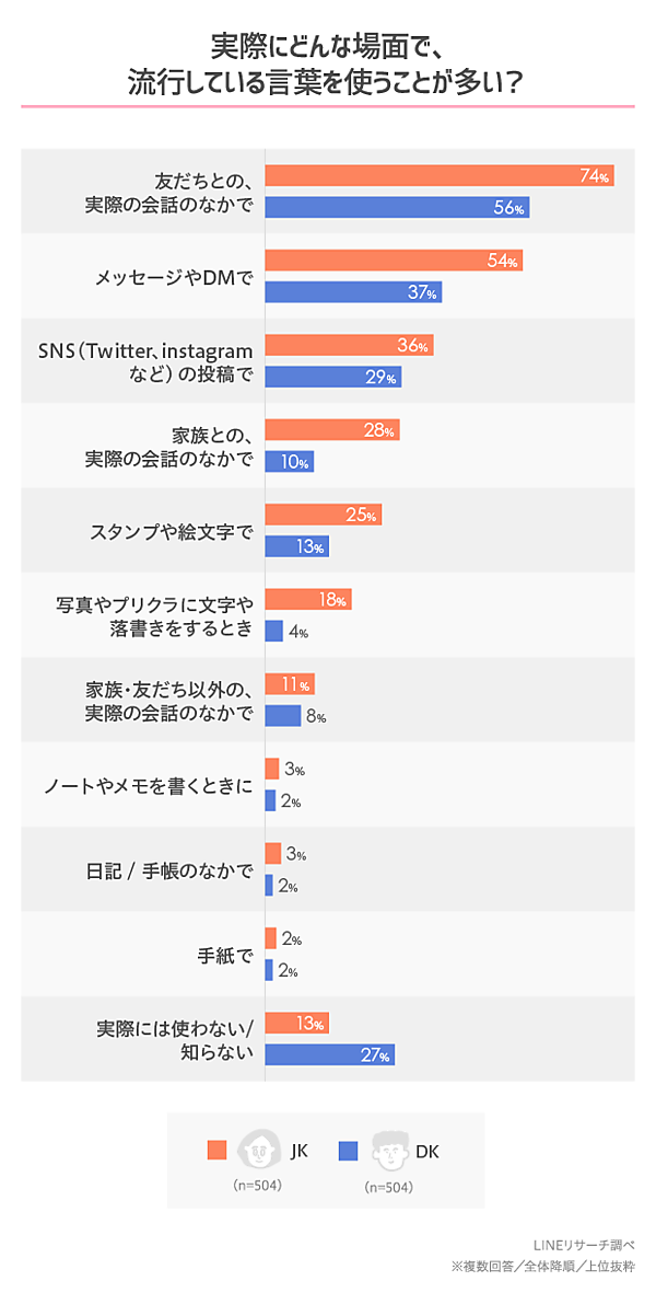 最後に「流行している言葉を実際にどんな場面で使うか」を聞くと、全体では「友だちとの、実際の会話のなかで」が、男子高校生74%、女子高校生56%で最もおおい。以下「メッセージやDMで」、「SNS(Twitter、Instagramなど)の投稿で」が続き、ネットでの利用が2位・3位となった。全体的に女子より男子のほうが流行語を使っているようだ。