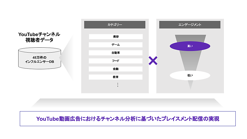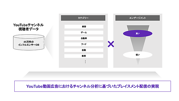 カテゴリー別に広告配信チャンネルを選ぶとともに、各チャンネルのエンゲージメント率に基づき、ハイエンゲージメントを得ているチャンネルを選定。エンゲージメント率は視聴者のコメント解析、高評価の割合、視聴回数から算出する。例えば、カテゴリー別にトップ300チャンネルを絞り、この中からハイエンゲージメントなチャンネルに絞り込んで配信する。