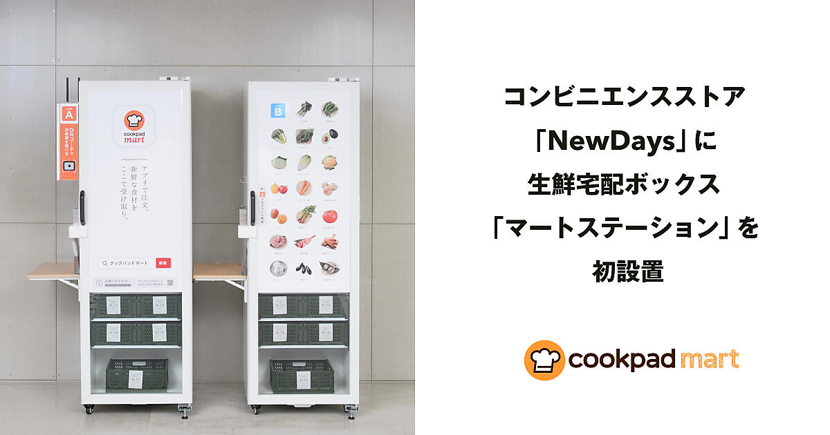 料理レシピサイトや生鮮食品ECを運営するするクックパッドは、生鮮食品EC「クックパッドマート」の商品受け取り場所となる生鮮宅配ボックス「マートステーション」をコンビニエンスストア「NewDays(ニューデイズ)」に初めて設置した、と5月31日発表した。「JR目黒MARCビル」(東京都品川区)1階に同日オープンした店舗に設けた。