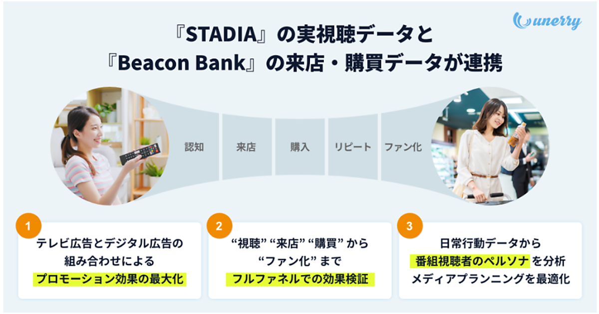 フルファネルは顧客の行動プロセスごとに広告施策を組み合わせるマーケティング戦略。連携によって、番組・CM視聴者と非視聴者のグループに向け、unerryの位置情報活用のデジタル広告配信サービス「Beacon Bank AD」の配信が可能になる。STADIAの視聴データとBeacon Bankの来店・購買データから広告接触者の効果検証も実現する。