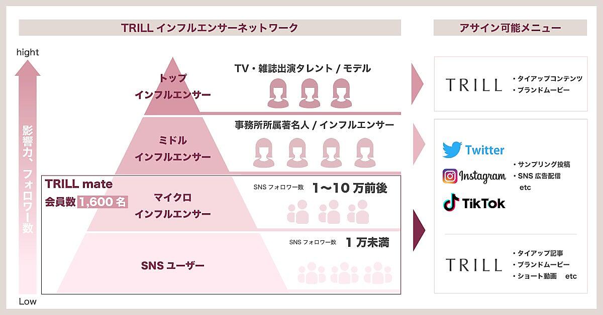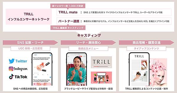 美容やコスメ、ファッションを扱う女性向けメディア「TRILL(トリル)」を展開するdelyは、「TRILLインフルエンサーネットワーク」の提供を6月から始める、と6月8日に発表した。「Twitter」「Instagram」「TikTok」などSNS上での商品体験投稿や、投稿クリエイティブを用いたSNSの広告配信、TRILLプラットフォーム内のタイアップコンテツや動画広告メニューにキャスティングしたマーケティングプランニングができる。