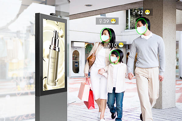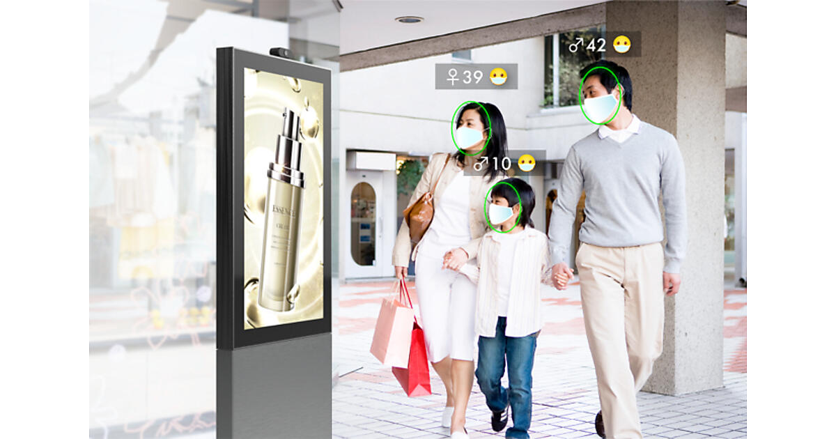 視聴分析するエンジンには、デジタルサイネージシステムを開発するニューフォリアの「Vision Eye」を採用した。ディスプレイに取り付けたカメラが取得した情報からクラウド上のAI(人工知能)が「通行者数(トラフィック数)」とサイネージの「視聴者数(オーディエンス数)」を計測・集計し、視聴者の性別や年齢を解析する。