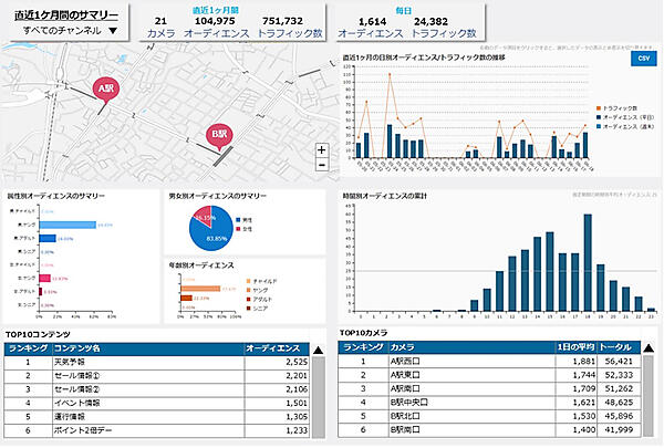 集計と解析結果は、設置場所別や時間帯別、コンテンツ別に表やグラフで可視化してフィードバックする。視聴者数の多いサイネージやコンテンツのランキングも提供できる。新規設置だけでなく既設のデジタルサイネージにも導入が可能だ。属性解析の際に顔画像のデータを一時的に取得するが、解析後は即時削除する。