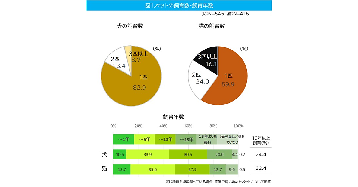 まず、犬猫の飼育数・飼育期間を見ると、やはり1匹という人が一番多いが、犬は1匹という人が82.9%に達するのに対し、猫は1匹59.9%と低く、2匹、3匹以上といった多頭飼いの割合が大きい。