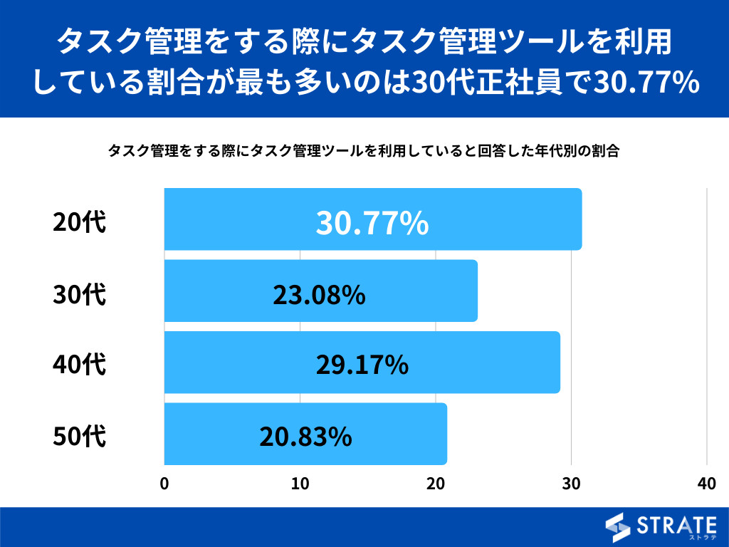 「タスク管理ツールで」と回答した66人を年代別で見ると「20代」30.77%が最も多く、次いで「40代」29.17%となった。