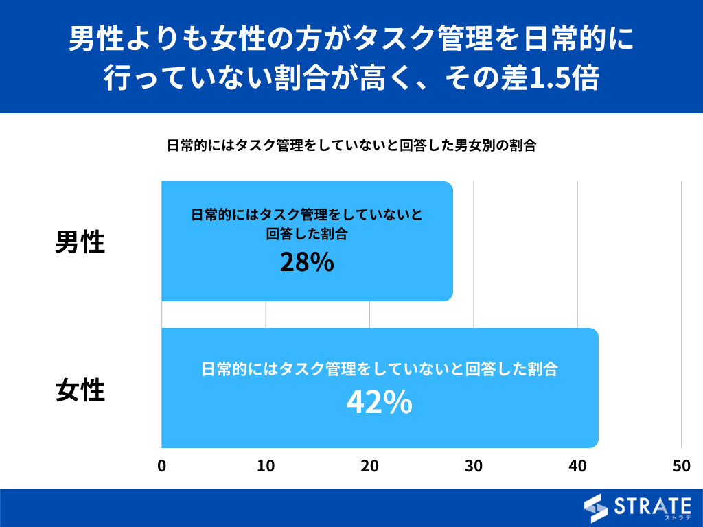 さらに「タスク管理を日常的に行っていない」と回答した105人を男女別で見ると、「男性」28%に対し、「女性」42%とかなりの差異が見られた。