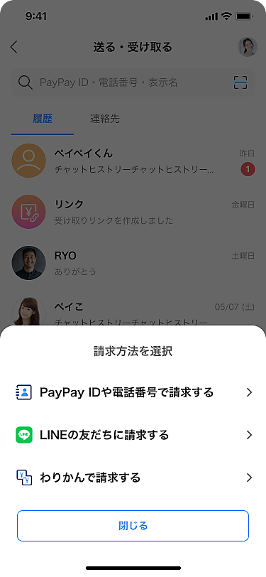 送る・受け取るに追加したのは、PayPayアプリのユーザーがLINEの友だちに向けて金額を指定してリクエストを送る機能。この新機能によってユーザーは、送る・受け取るの画面から「請求」「LINEの友だちに請求する」を選ぶと、請求額を設定したうえで、リクエストしたい相手をLINEの友だちから容易に選ぶことができる。