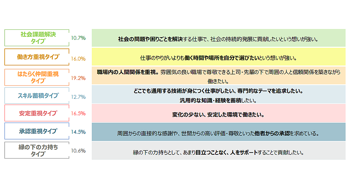 - はたらく仲間重視タイプ: 職場内の人間関係を重視。雰囲気の良い職場で尊敬できる上司・先輩の下で周囲の人と信頼関係を築きながら働きたい。