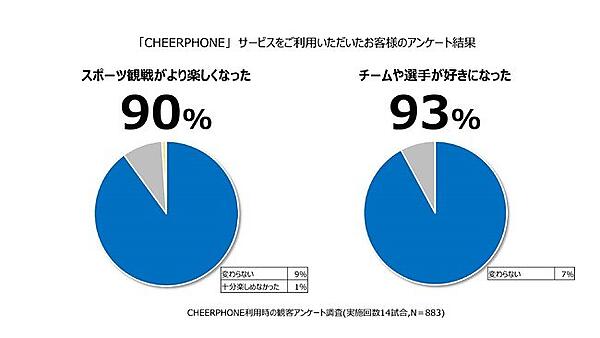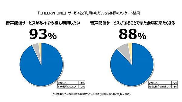 アンケートの結果、リアルタイム音声配信サービスを体験する前と比較して「スポーツ観戦そのものが楽しくなった」が90%、「チームや選手への理解が深まりより好きになった」が93%にのぼった。サービスの継続利用については「音声配信サービスがあればまた利用したい」が93%、「音声配信サービスがあることでまた会場に来たくなる」が88%だった。