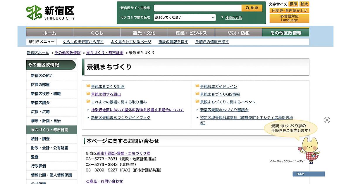サポートチャットは景観・まちづくり課のサイトでイメージキャラクター「ユーディ」のアイコンをクリックすると起動。「景観の事前協議書の届出時期について」「地区計画の届出の流れ」など、質問事項を入力して利用する。サポートチャットボットはユーザーの質問パターンが蓄積されることで回答の精度が高まっていく。JTBや厚生労働省も使用している。