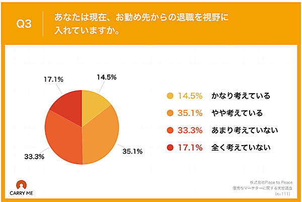 そして「勤め先からの退職を視野に入れているか」と聞くと、「かなり考えている」14.5%、「やや考えている」35.1%で、計49.6%が退職を考慮していた。