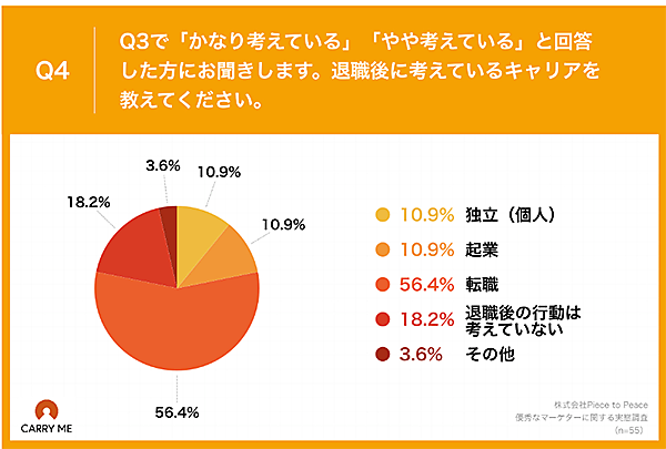 これら55人に「退職後に考えているキャリア」を聞くと、「転職」56.4%が最多。一方で、「独立(個人)」10.9%、「起業」10.9%という回答も存在する。また「退職後の行動は考えていない」18.2%もそれに並ぶ。
