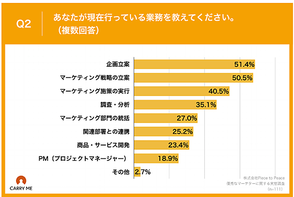 「現在行っている業務」については、「企画立案」51.4%、「マーケティング戦略の立案」50.5%、「マーケティング施策の実行」40.5%が上位だった。