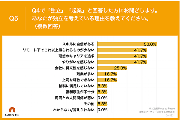 なお「独立」「起業」と答えた12人に理由を聞くと、「スキルに自信がある」「リモート下でこれ以上得られるものが少ない」「理想のキャリアを追求」「やりがいを感じない」といった声が多いようだ。一方「家族との時間をもっとつくりたい」「評価に不満がある」といった意見も少数ながらあがっている。