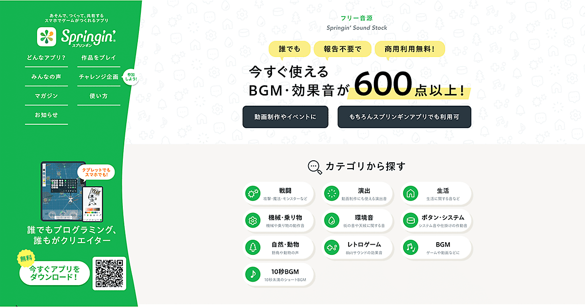 システム開発のしくみデザイン(福岡市)は、音素材を無料で使えるフリー音源ストックサイト「Springin’ Sound Stock(スプリンギンサウンドストック)」を6月23日にオープンした、と同日発表した。過去に制作したインタラクティブコンテンツで使用した音源や、同社サウンドデザイナーが新たに手掛けた音源を中心に10カテゴリー・600点以上のBGM・効果音が誰でも無料で使える。動画制作やイベントなど商用利用も可能。