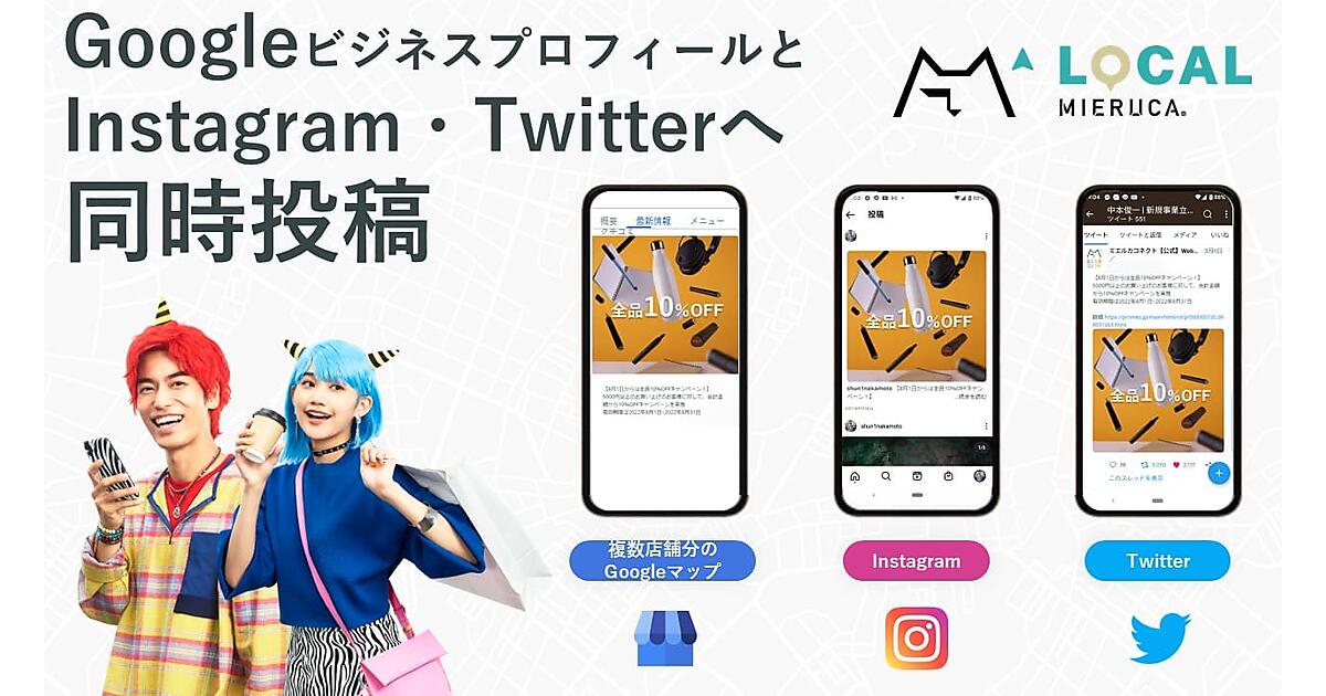 ローカルミエルカは、GBPなどの店舗情報を一元管理し、消費者の検索画面で店舗情報を上位表示させるローカルSEO(検索エンジン最適化)を支援する。ローカルミエルカの管理画面から投稿すると、複数のGBPの最新情報だけでなく、指定したTwitterやInstagramアカウントにも一括投稿・配信が可能になった。店舗ごとに異なるURLに遷移させることや、時間を指定した予約投稿、ハッシュタグ設定もできる。