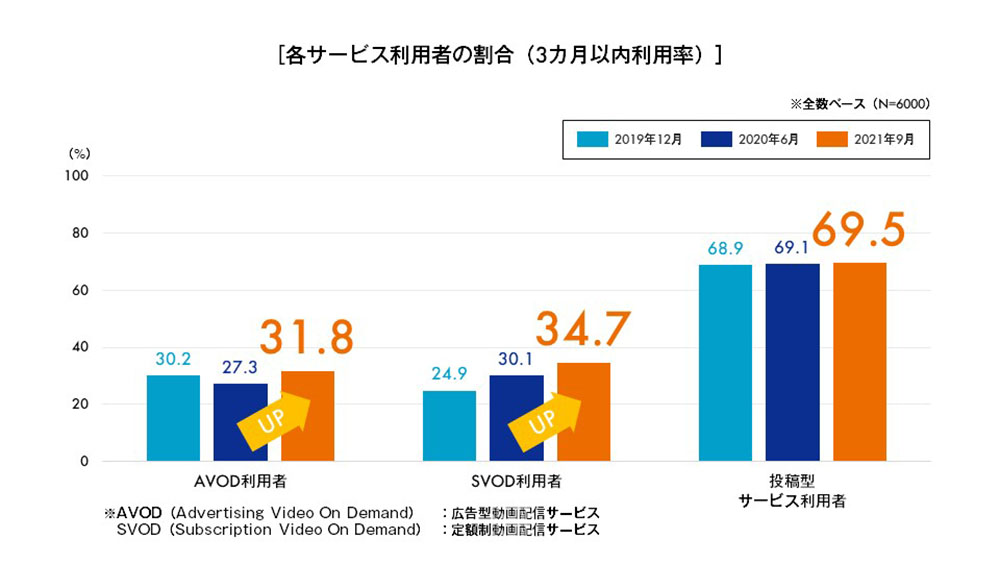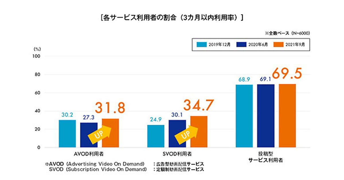 CARTA COMMUNICATIONS(CCI)は、国内の動画配信サービスについて視聴動向および広告評価を調査した。2019年12月、2020年6月に続き2021年9月に調査を実施し、一般ユーザ6,000人から回答を得ている。