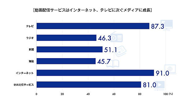 それによると、まず「各メディアの利用率」は、「インターネット」91.0%が最も高く、「テレビ」87.3%、「動画配信サービス」81.0%が続いた。いわゆる4マスメディア(テレビ・ラジオ・新聞・雑誌)はテレビ以外は低く、かろうじて「新聞」が51.1%の利用率だった。