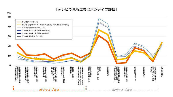 デバイス別の広告評価を見ると、「テレビで見る動画広告」(コネクテッドTVなどで見る広告)は「テレビCM」に次いでポジティブ評価が高い。視聴機器により広告の評価が大きく影響されていることがうかがえる。