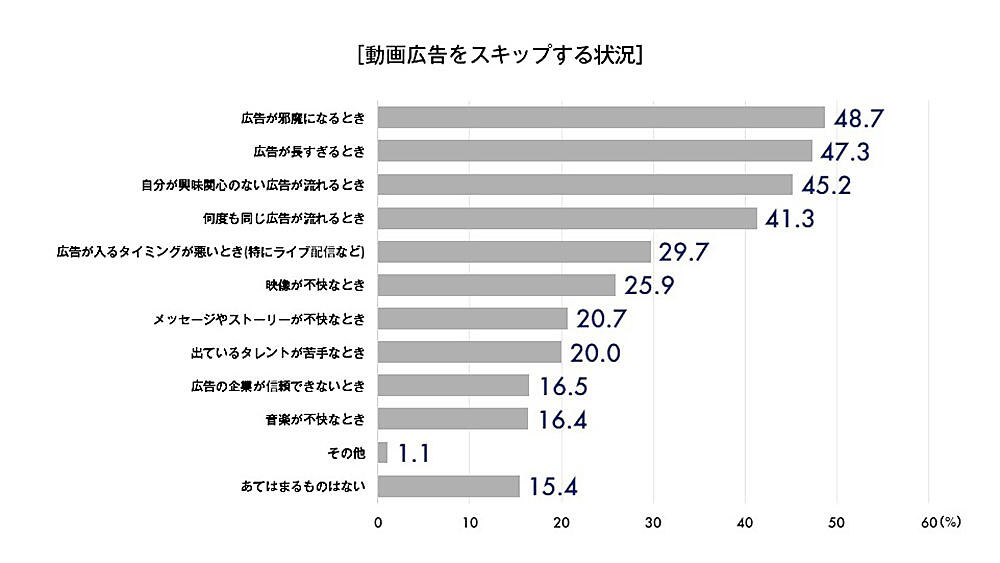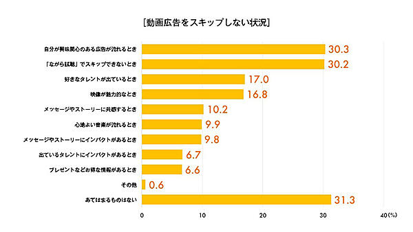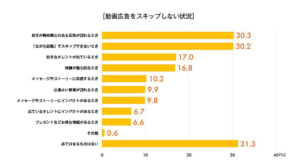 「動画広告をスキップしない理由」について聞くと、「自分が興味関心のある広告が流れた」「ながら視聴でスキップできない」が上位だった。一方スキップする理由では「自分が興味関心のない広告が流れた」が多く挙げられた。