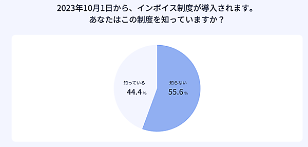 一方マネーフォワードの調査では、中小企業経営者・事業主に「インボイス制度を知っているか」と聞くと、55.6%が「知らない」と回答している。調査時期が2021年11月のため、現在はもう少し増加していると思われるが、それでもかなり認知度が低い。