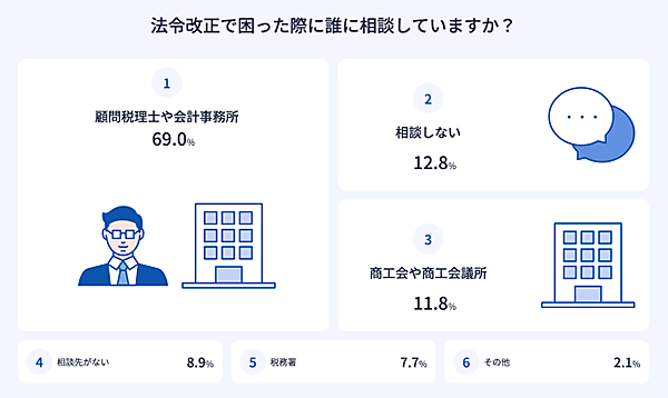 なお「法令改正で困った際に誰に相談しているか」については、「顧問税理士や会計事務所」69%が多数だが、「相談しない」12.8%、「相談先がない」8.9%といった層も存在した。